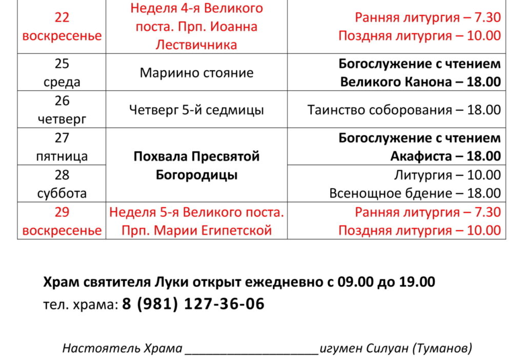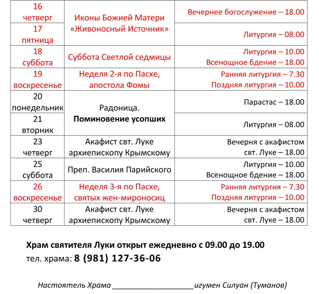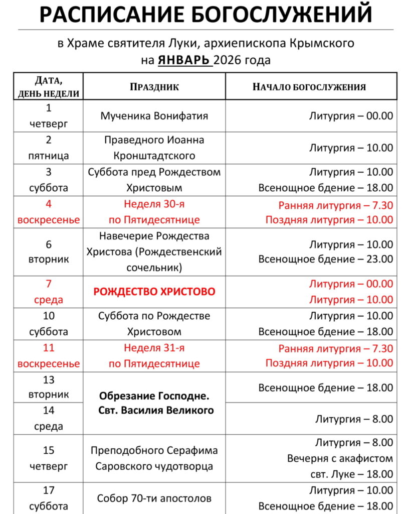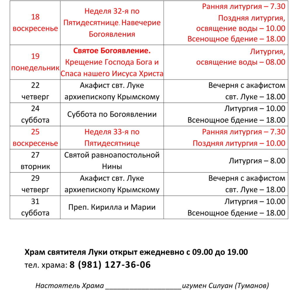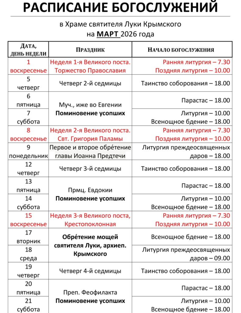 Расписание богослужений